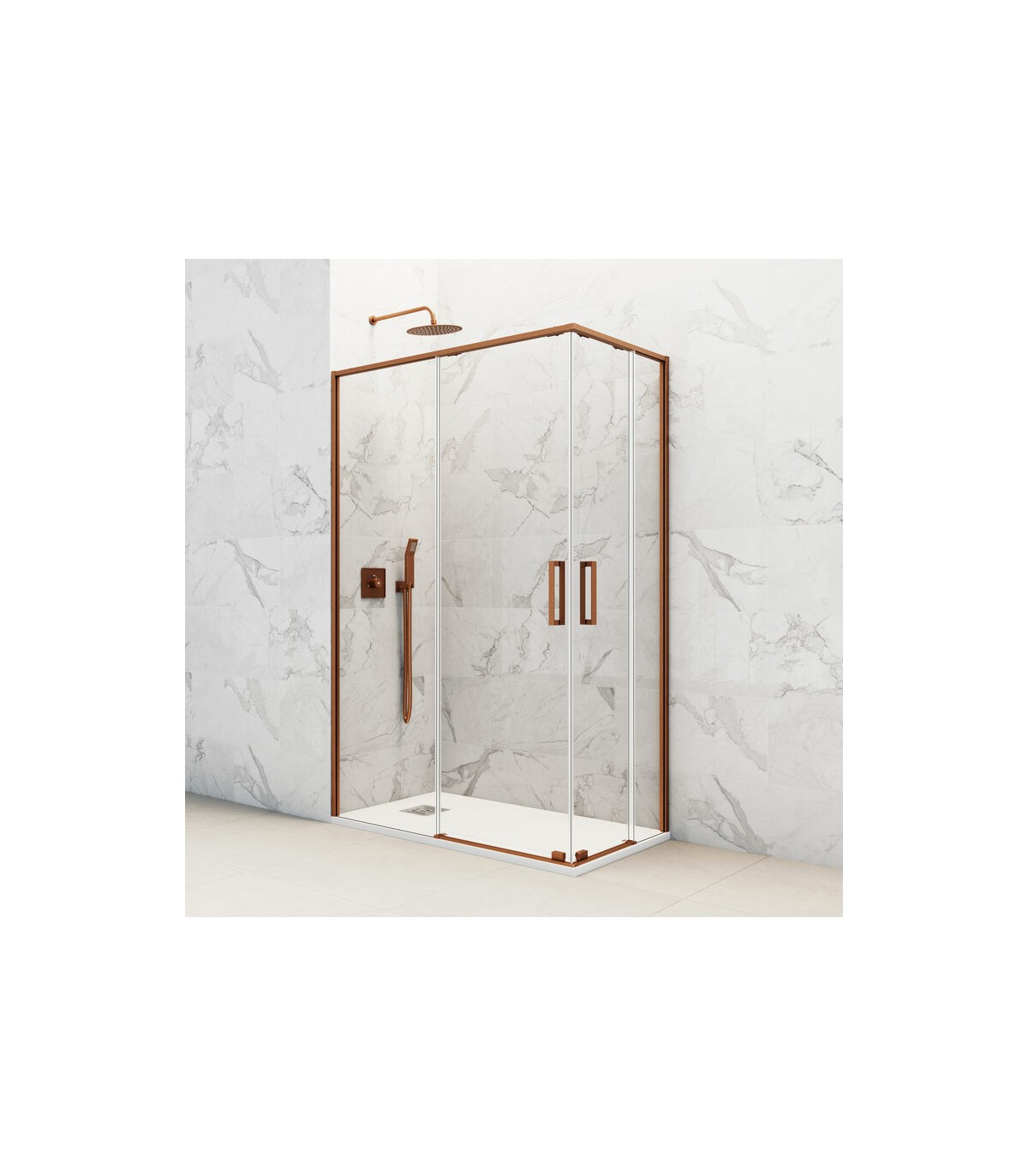 Formato di box doccia angolare con 2 fissi e 2 porte scorrevoli con chiusura al vertice.