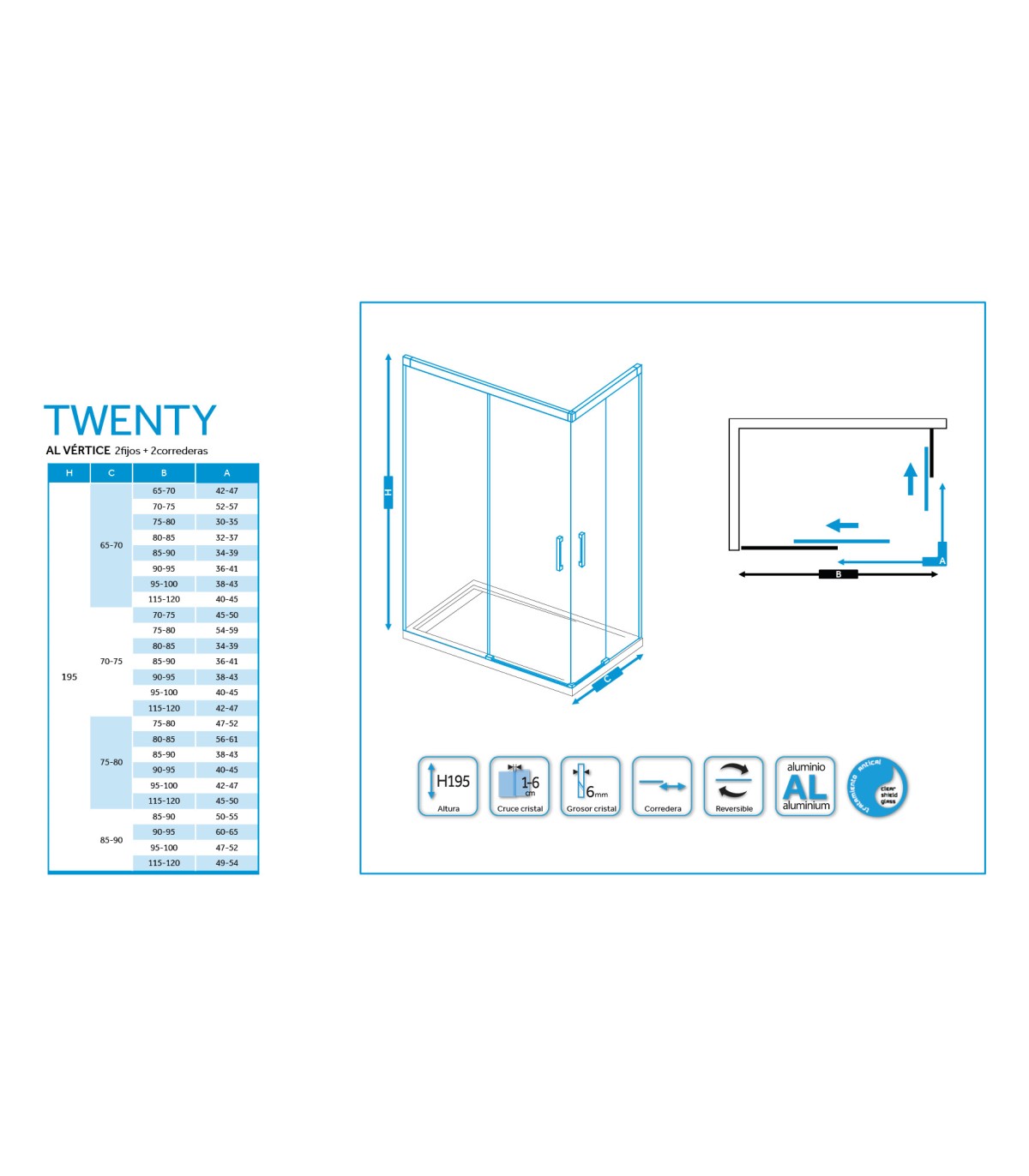 Formato di box doccia angolare con 2 pannelli fissi e 2 porte scorrevoli con chiusura al vertice.