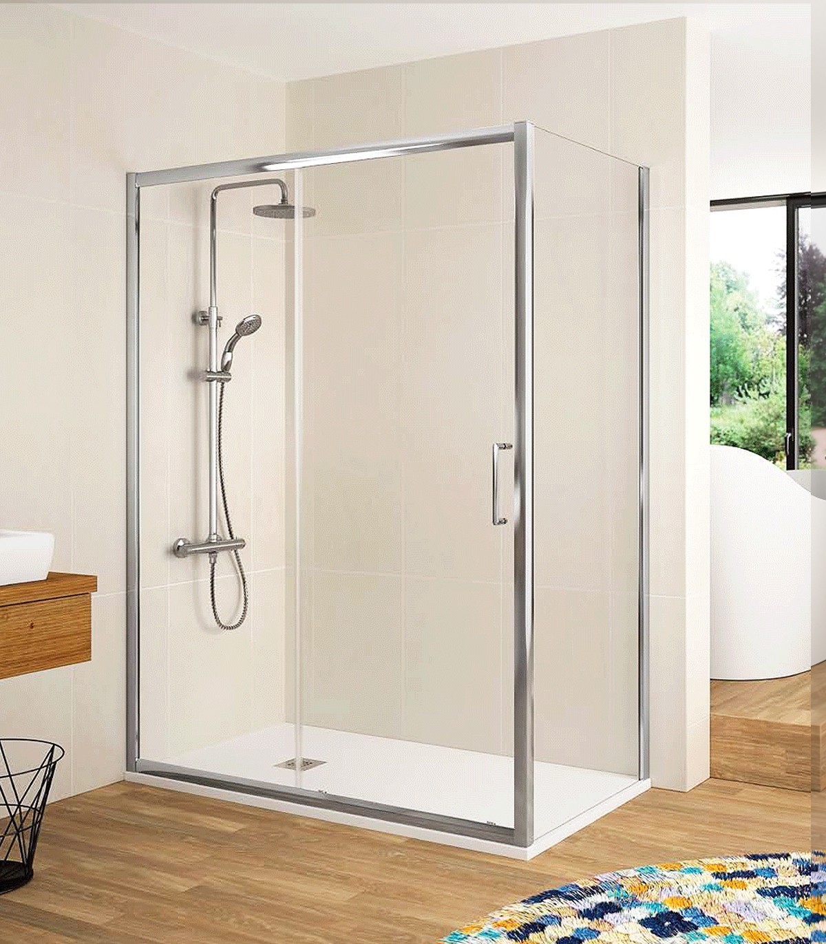 Box composto da un pannello fisso in vetro da 6 mm e una porta scorrevole da 6 mm.