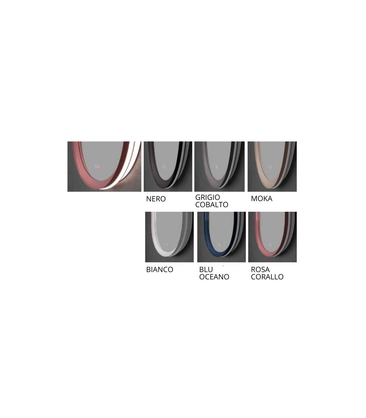 Disponibile con cornice in un massimo di 6 finiture: Nero Opaco, Bianco Opaco, Moka, Grigio Cobalto, Blu Oceano e Rosa Corallo.