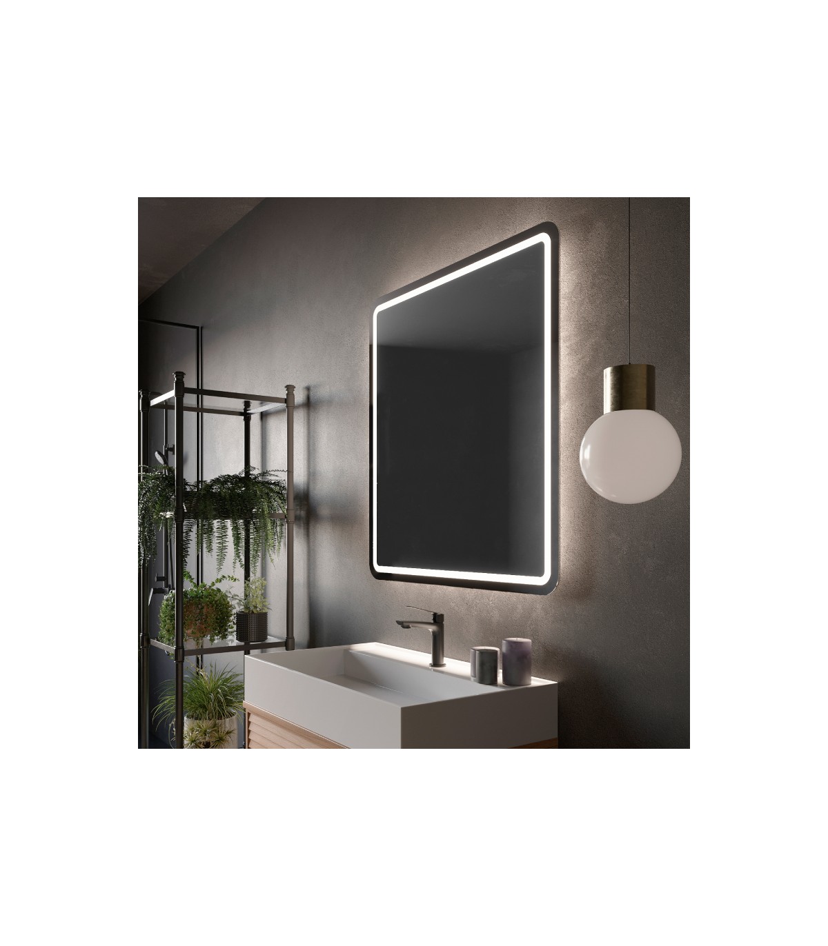 Specchio quadrato con bordi arrotondati e illuminazione a LED, modello AUSTRIA.