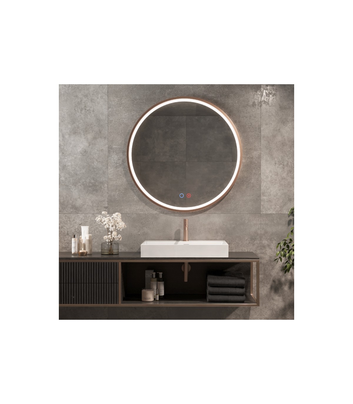 - Specchio rotondo liscio con supporto in alluminio.